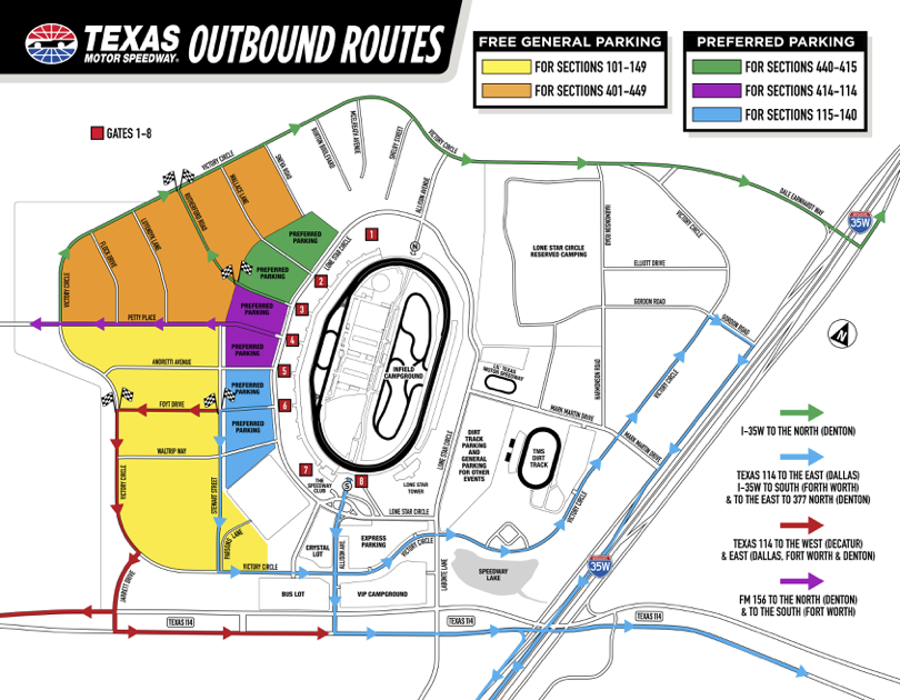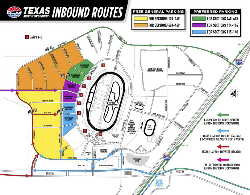 For the most accurate directions and routing to Texas Motor Speedway camping and parking lots, please use the following Waze links: