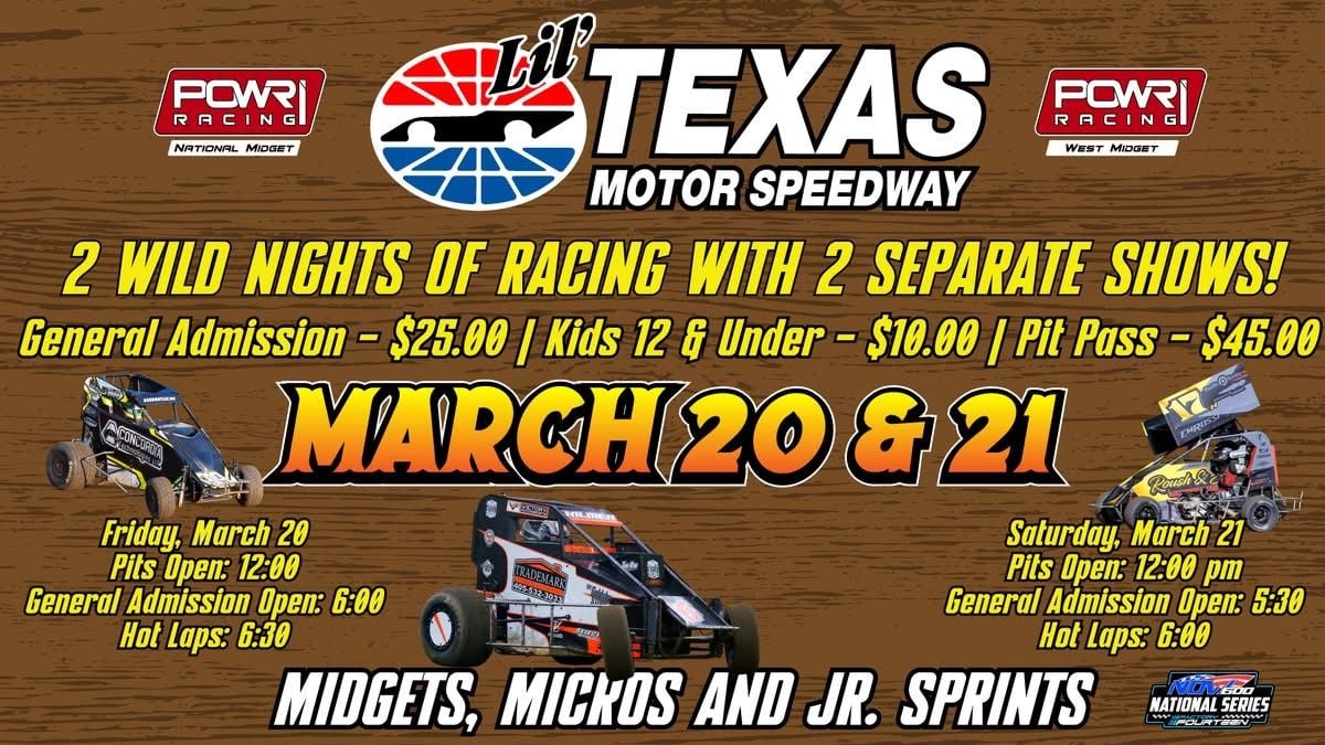 FORT WORTH, Texas (March 18, 2026) – Dirt racing returns to Texas Motor Speedway Friday and Saturday night as the POWRi National and West Midget Leagues as well as the Factory Fourteen National Open Wheel 600 Series put the pedal to the metal at Lil’ Texas Motor Speedway.